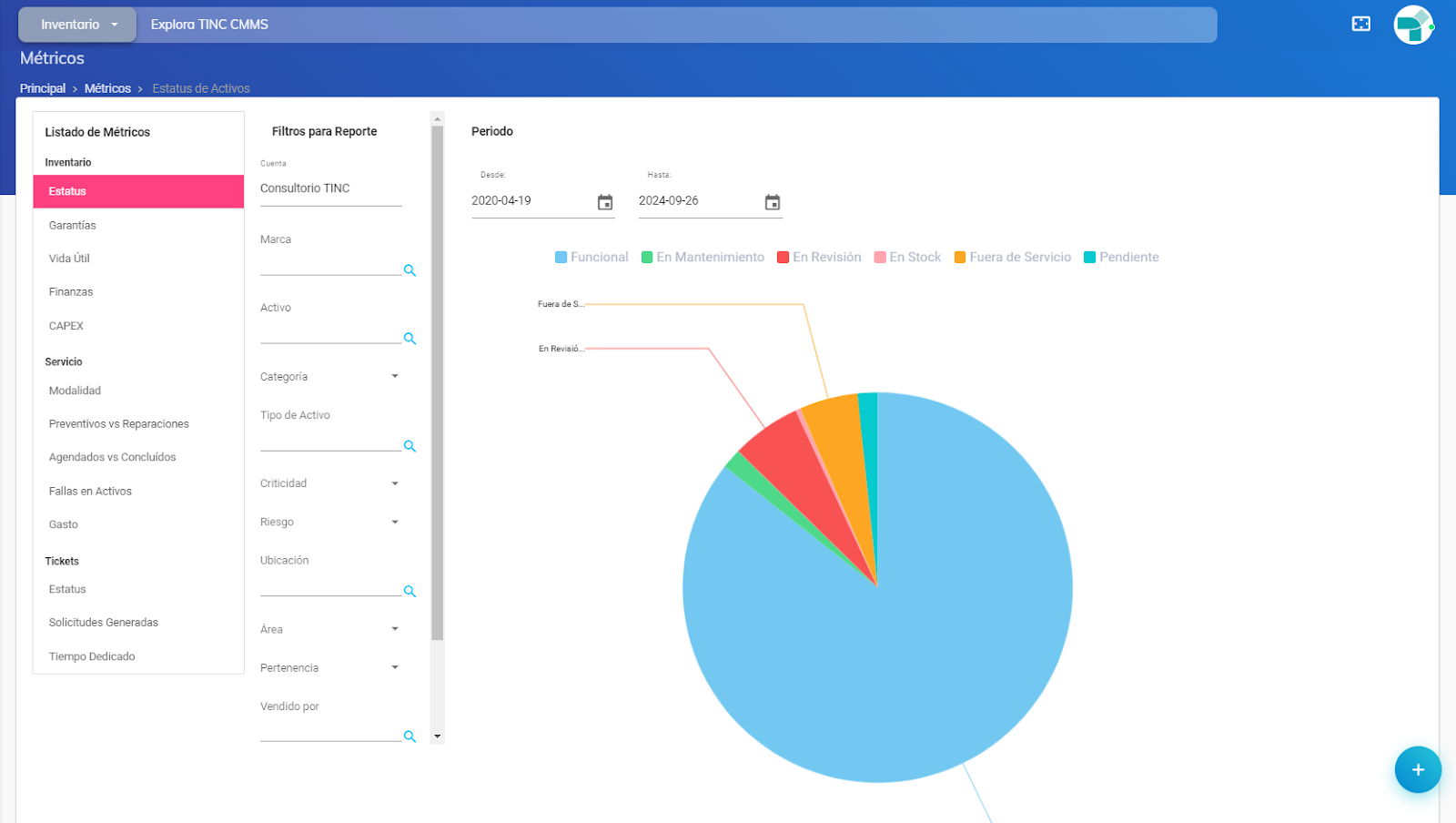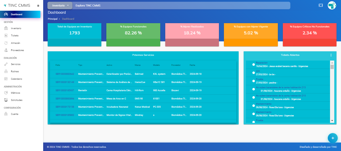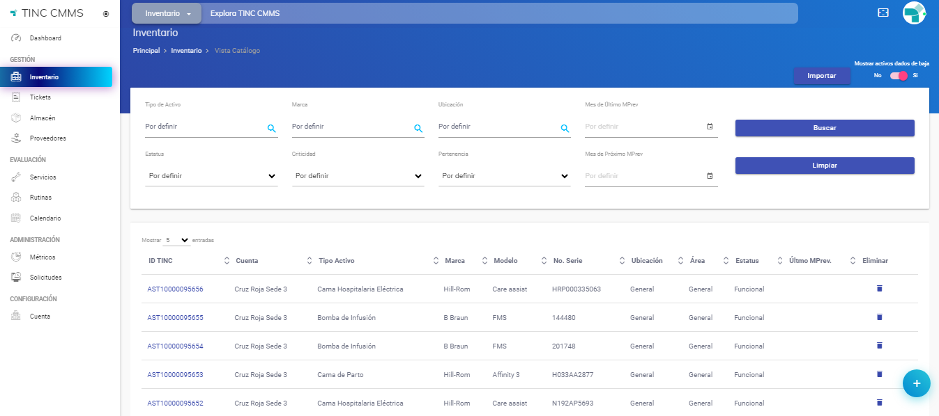 - Inventario: Módulo donde se encuentran listados todos los activos registrados, cada uno con su correspondiente ID TINC. La información de cada activo incluye la cuenta a la que pertenece, tipo de activo, marca, modelo, número de serie, ubicación, área, fecha del último mantenimiento preventivo y la opción de eliminar el activo. Asimismo, el módulo ofrece una serie de filtros para facilitar la búsqueda de activos específicos y la opción de importar o cargar múltiples activos de manera masiva.
