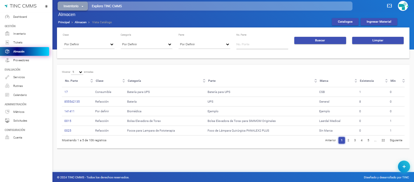 - Almacén: Módulo donde se encuentran listados todas las piezas, partes, y/o materiales que hayan sido registrados, con sus respectivos números de parte, a que clase corresponden, a qué categoría corresponden, nombre de la pieza/parte/material y cantidad en existencia. Asimismo, cuenta con una serie de filtros para poder buscar la parte deseada, un acceso a los catálogos de almacén (en el módulo de configuración) donde se pueden agregar o modificar categorías de piezas, y el mínimo de existencias de esa parte. Desde aquí también es donde se realiza el registro de las piezas y/o materiales.
