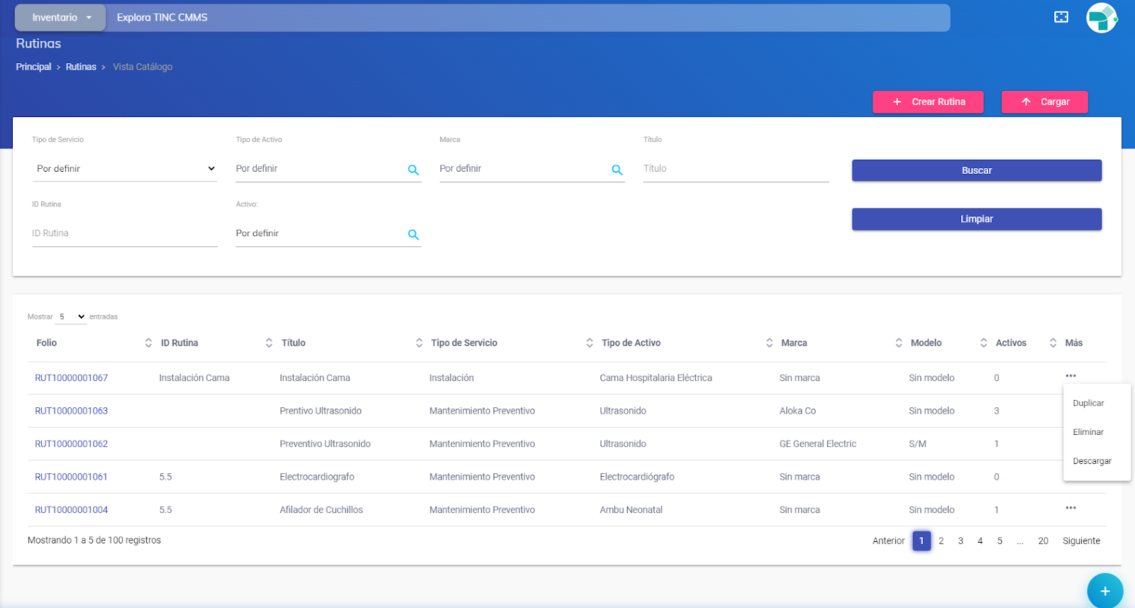 - Rutinas: Módulo donde se encuentran listados todos las rutinas que hayan sido registradas, con sus respectivos folios, ID de rutina, título, tipo de servicio, marca, modelo, cantidad de activos implicados, y las opciones de duplicar, eliminar o descargar. Cuenta con una serie de filtros para poder buscar la rutina deseada, y las opciones de cargar y crear rutina.