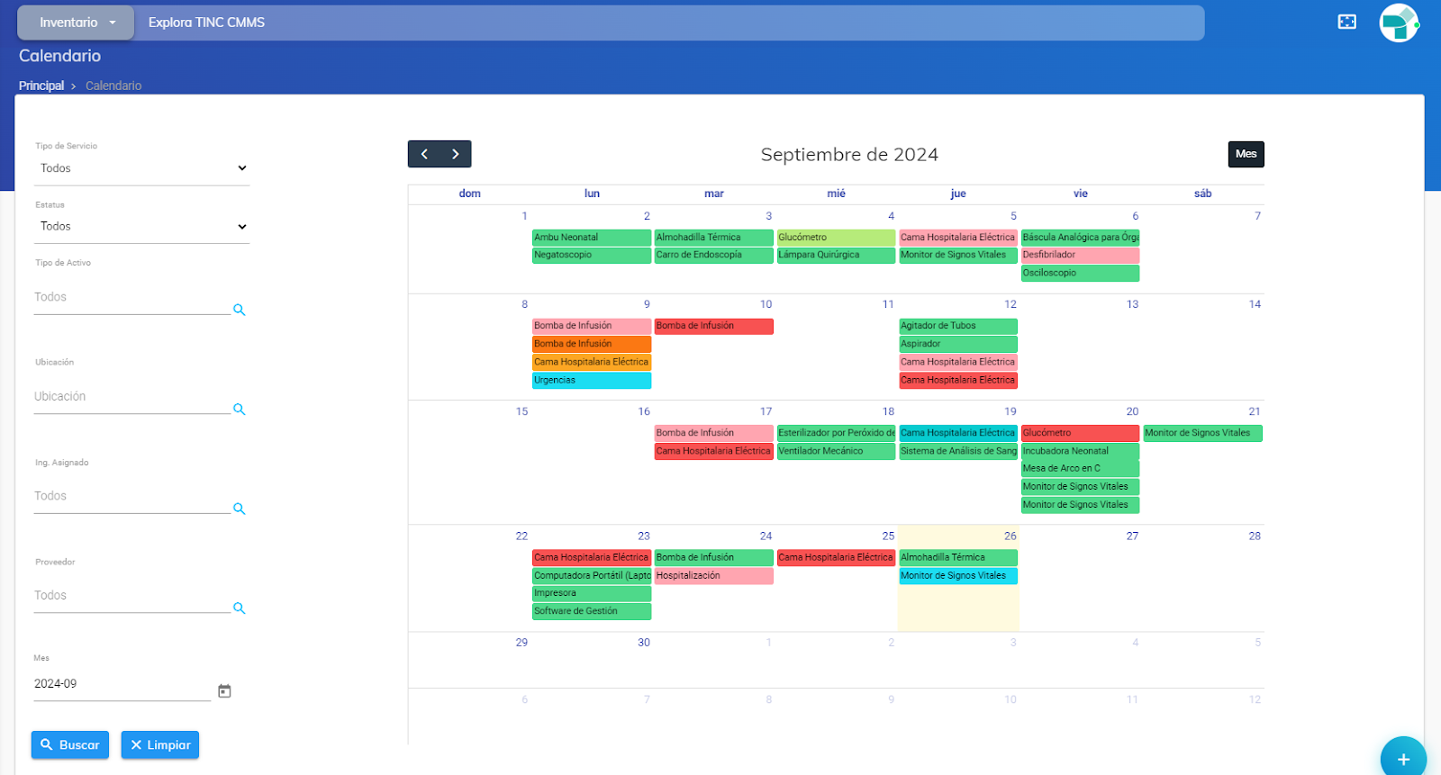 - Calendario: En este módulo es posible la visualización de los servicios programados y concluidos a través de un calendario. Asimismo, dispone de una serie de filtros que permiten buscar el servicio deseado de manera eficiente.