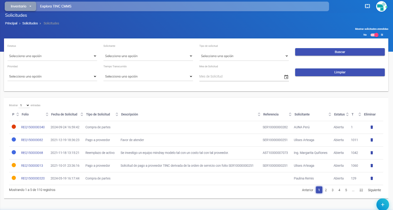 - Solicitudes: Módulo donde se encuentran listados todas las solicitudes que hayan sido registradas, con sus respectivos folios, fechas de solicitud, tipo de solicitud, breve descripción, referencia, solicitante, estatus, P, T, y la opción de eliminar. Asimismo, cuenta con una serie de filtros para la búsqueda de la solicitud deseada.