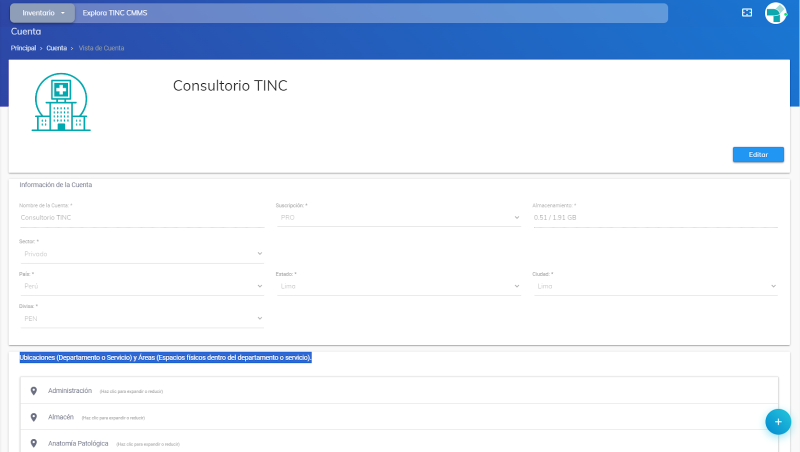 - Cuenta: En este módulo se presenta la vista de la cuenta, que incluye el nombre de la cuenta, imagen (con la opción de cargar una nueva), información detallada de la cuenta, así como el listado de ubicaciones (departamento o servicio) y áreas (espacios físicos dentro del departamento o servicio).