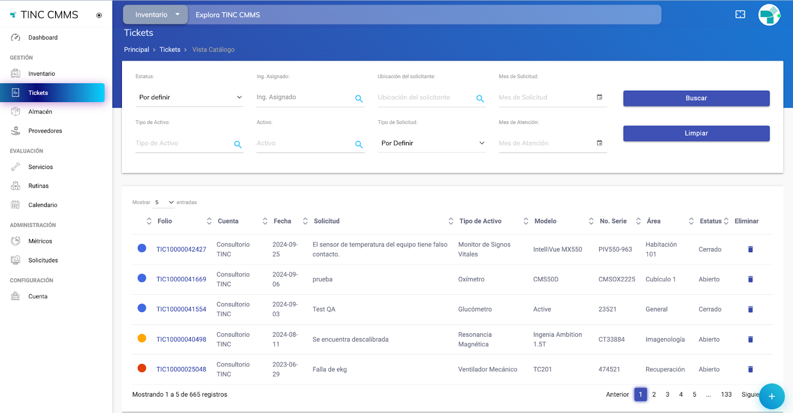 - Tickets: Módulo donde se encuentran listados todos los tickets que hayan sido registrados, con sus respectivos folios, cuenta a la que corresponde, fecha de registro, tipo de solicitud, tipo de activo, modelo, número de serie, área, estatus, y la opción de borrar ticket. Asimismo, cuenta con una serie de filtros para la búsqueda de tickets deseados.