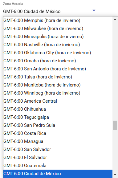 Para elegir o cambiar la zona horaria / huso horario, seleccionamos el espacio debajo de Zona horaria, donde nos desplegará un listado de zonas horarias a elegir.