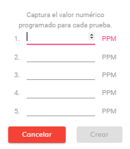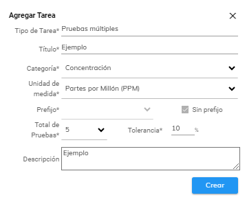 - Pruebas múltiples: Esta tarea permite registrar valores de múltiples pruebas indicadas, solicitando indicar el Título*, la Categoría*, la Unidad de la medida*, Prefijo* (y la opción de que no lleve prefijo), Total de pruebas*, Tolerancia* en porcentaje, y una descripción.