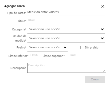 - Medición Entre Valores: Esta tarea permite registrar un valor entre límites especificados. Nos pide indicar el Título*, la Categoría*, la Unidad de la medida*, Prefijo* ( la opción de que no lleve prefijo), Límites Inferior* y Superior*, y una descripción.