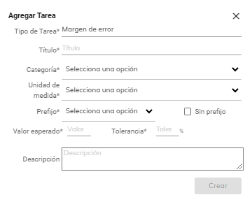 - Margen de error: Esta tarea permite registrar un valor con un margen de error especificado. Se solicitarán los siguientes datos: Título*, Categoría*, Unidad de medida*, Prefijo* (con la opción de no incluir prefijo), Valor esperado*, Tolerancia* en porcentaje, y una Descripción.