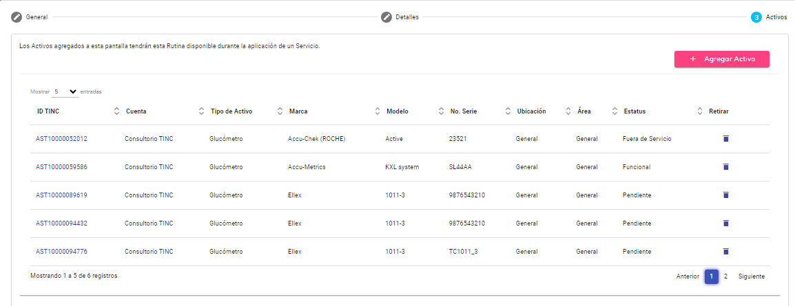 - Activos: La tercera y última sección permite agregar los activos a los cuales se aplicará la rutina. Los activos incorporados en esta pantalla tendrán disponible esta rutina durante la ejecución de un servicio. Se presenta un catálogo de los activos, que incluye sus respectivos datos, y al seleccionar su ID TINC, se redirigirá a la Vista de Activo dentro del módulo de Inventario.