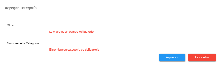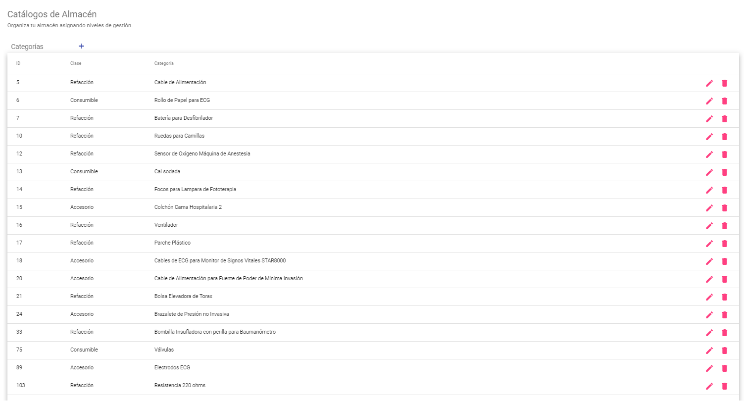 Se indica la clase* a la que pertenece y el nombre de la categoría*, asimismo, permite la edición con el ícono del lápiz o borrar con el ícono de basura.