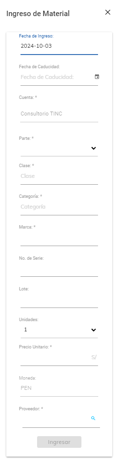 En la segunda opción disponible, al seleccionar Ingreso de Material, se despliega una sección en la que es posible dar de alta un material en el lado derecho. Se deben ingresar los siguientes datos: fecha de ingreso, fecha de caducidad, cuenta*, parte*, clase*, categoría*, marca*, número de serie, lote, cantidad de unidades, precio unitario*, moneda y proveedor*.