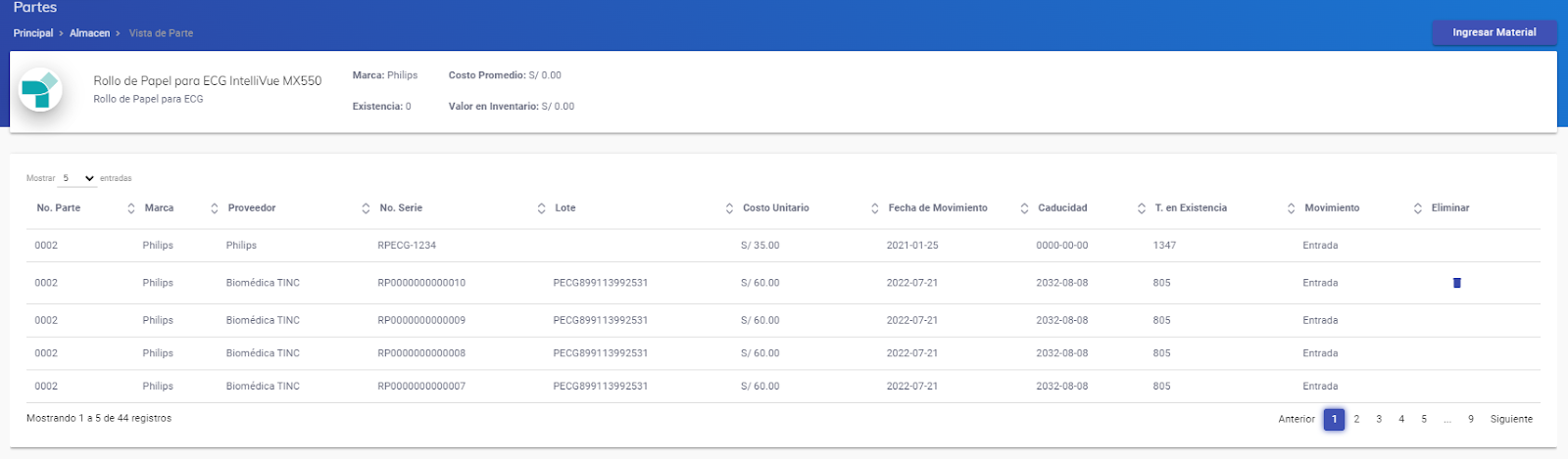 Aquí es posible la visualización de los datos del material y todas las partes que se incluyen en una lista tipo catálogo.