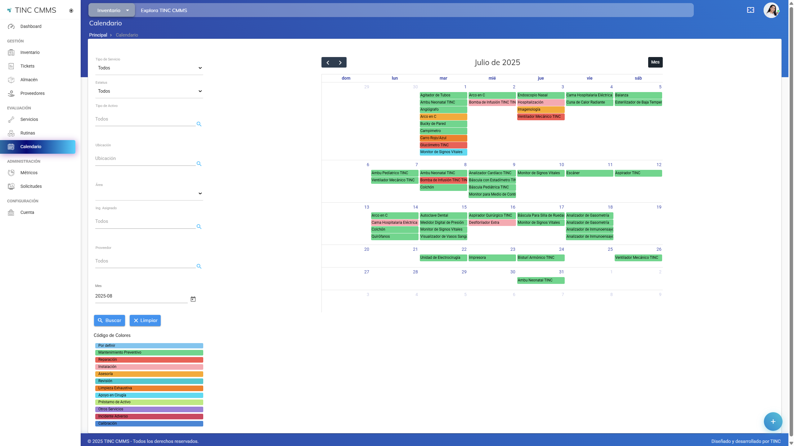 El Calendario en TINC CMMS IS permite visualizar de manera organizada los servicios programados dentro de una cuenta. Esta herramienta facilita la planeación, seguimiento y consulta de mantenimientos y servicios asignados.