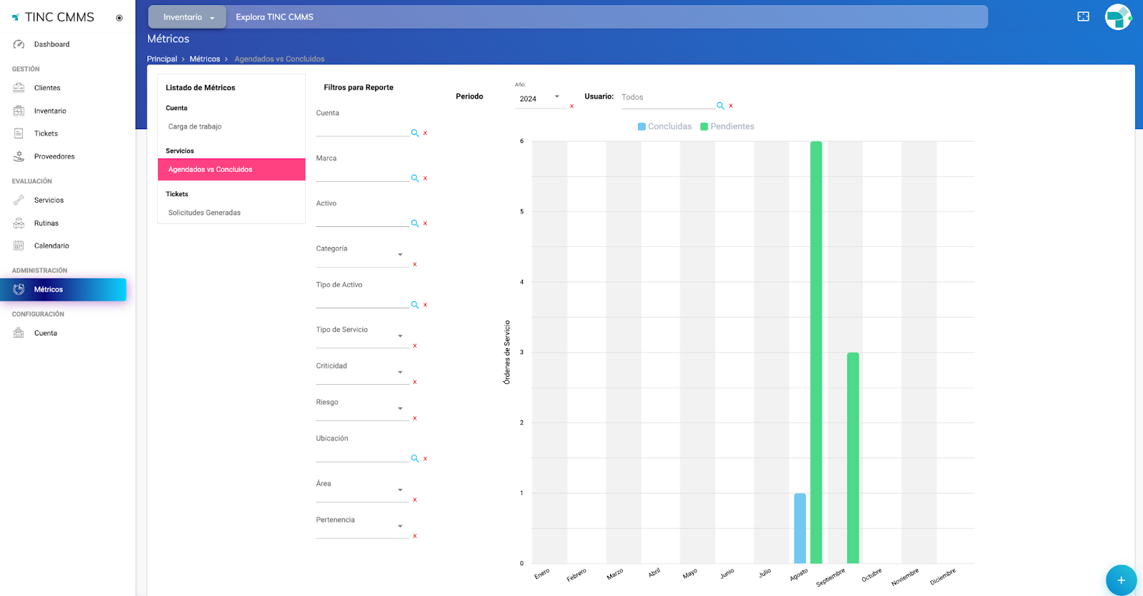 Es la p谩gina principal a la que se accede al iniciar sesi贸n en TINC CMMS ES. Desde este m贸dulo se obtiene una vista general del estado de la operaci贸n, incluyendo indicadores como: