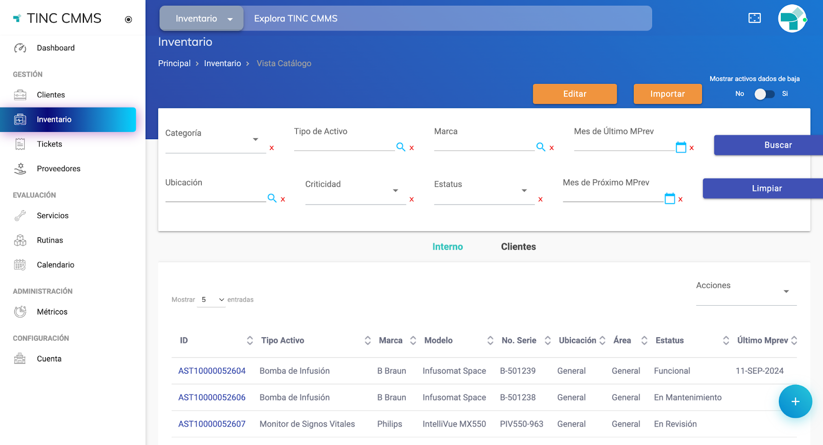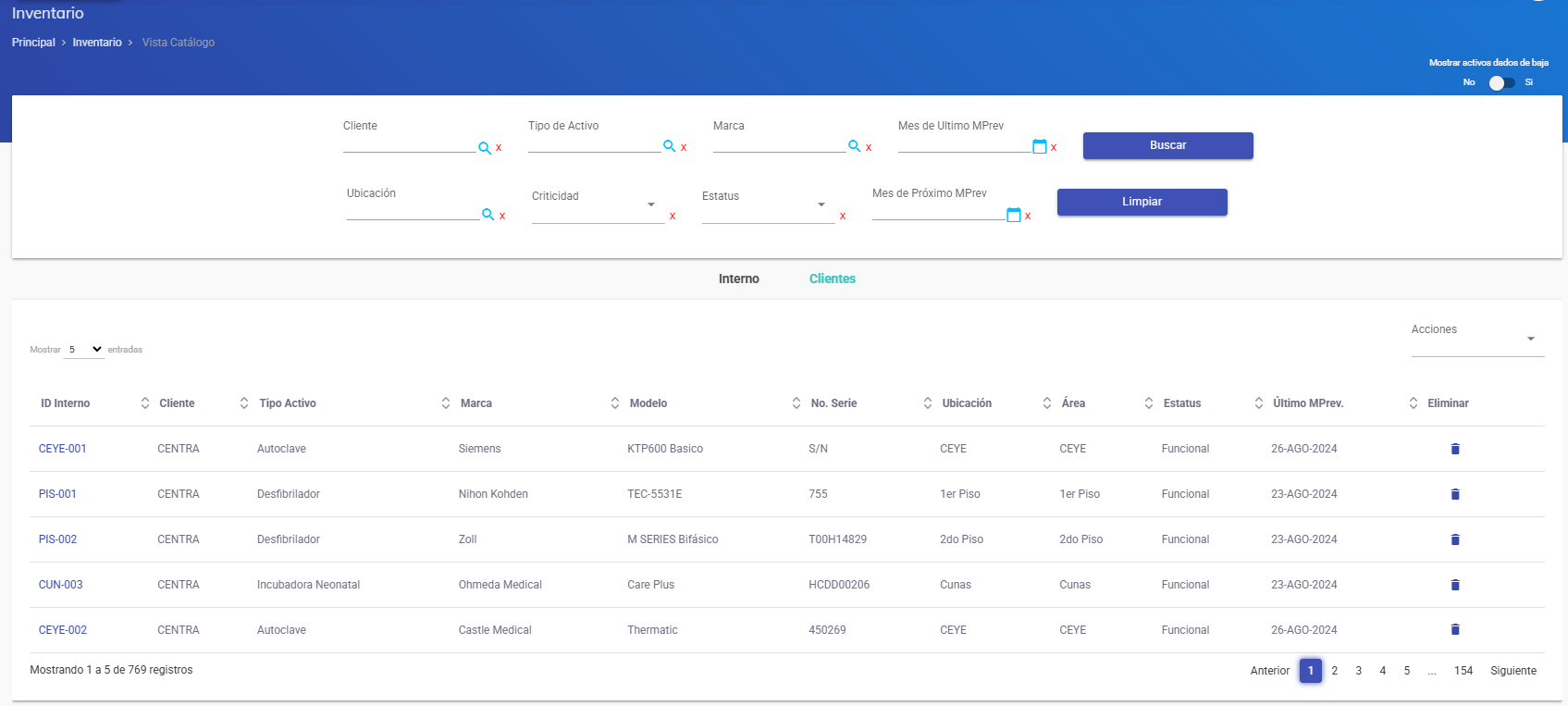 En este m贸dulo se visualizan todos los activos registrados, tanto del inventario interno como del inventario de clientes.