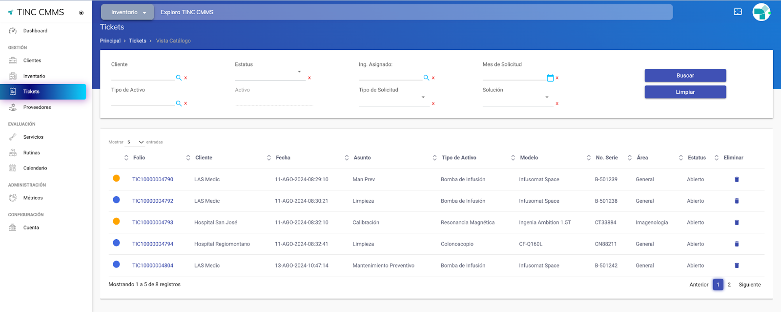 M贸dulo donde se listan todos los tickets registrados en la plataforma, mostrando datos como: