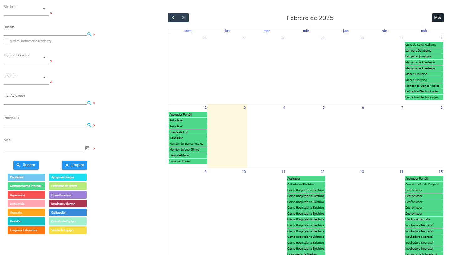 Permite visualizar los servicios programados y concluidos en formato calendario.