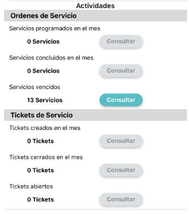 Una vez confirmado el mes y año a visualizar, en la página Principal aparecerán todas las actividades a realizar del módulo de Servicios y Tickets. Al seleccionar el ícono azul de consultar, redirige al usuario a los módulos correspondientes para visualizar los servicios o tickets programados, concluidos y vencidos en el mes.