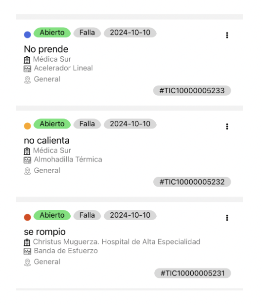 Dentro del modulo de tickets, cada Ticket cuenta con su motivo de alta correspondiente, folio, ubicación, cliente, activo y referencia de prioridad de cada folio.