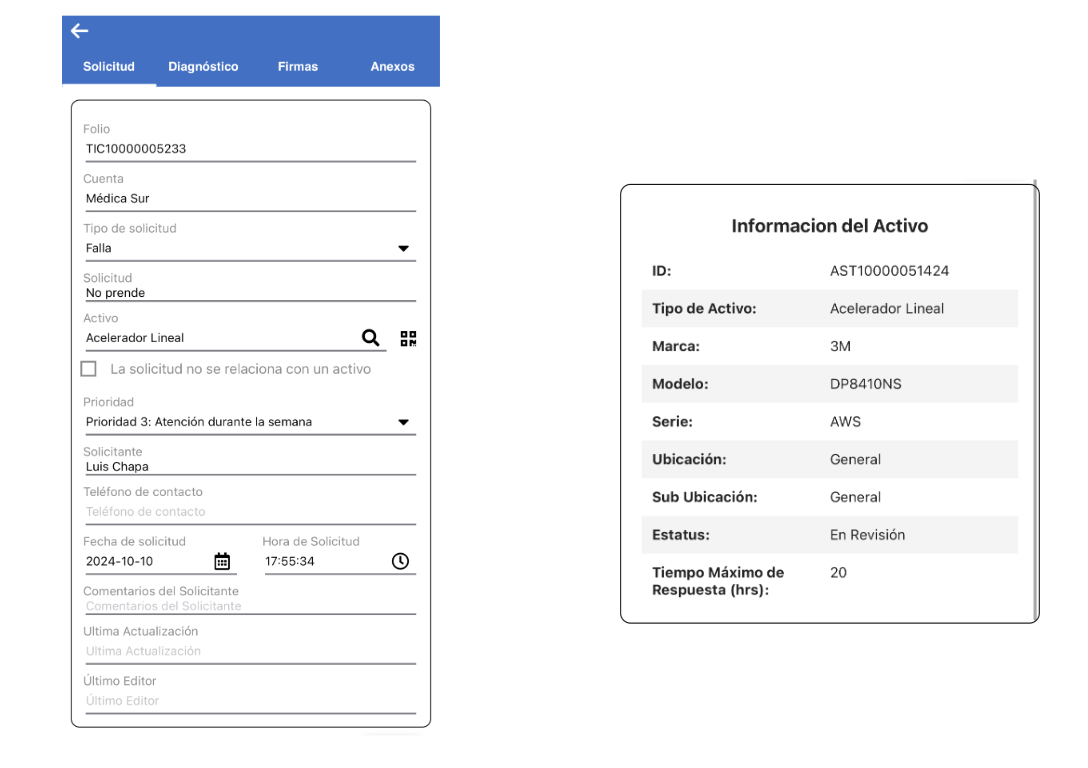 - Solicitud: En esta sección se presentan los datos básicos del ticket, los cuales fueron registrados al crearlo mediante el ícono + y que, asimismo, pueden ser editados en esta sección. En esta sección se muestra la información del activo asociado, con su ID correspondiente, ubicación y sub ubicación, así como el tiempo máximo de respuesta en hrs.