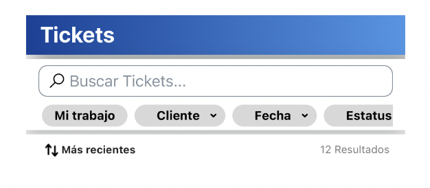 Dentro de Tickets, en la parte superior se cuenta con una barra de búsqueda de servicio así como un filtro que permite acceder rapidamente a un servicio específico mediante las opciones de cliente, fecha, estatus y tipo. En esta sección se revisará a profundidad las demás secciones que lo conforman así como las posibles operaciones dentro de dicho módulo.