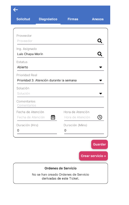 - Diagnóstico: En esta sección se muestran los datos acerca de la atención del ticket, incluyendo los datos de Solicitud, Ingeniero asignado, estatus, prioridad real, solución, fecha de atención así como su duración. Asimismo, en la esquina inferior derecha se encuentra un ícono rosa de Crear Servicio +, el cual al seleccionarlo nos redirige al módulo de Servicios para la creación de este.