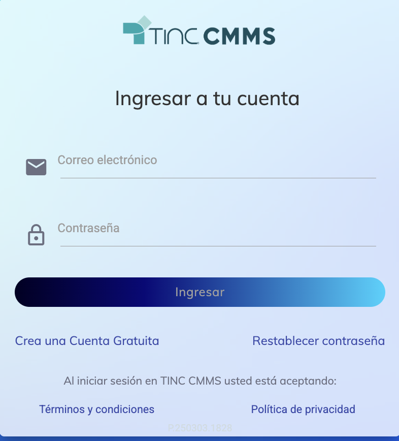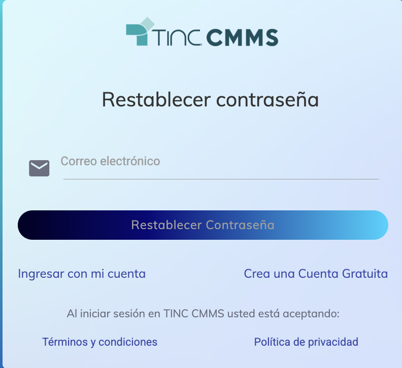 - En la pantalla de inicio de sesión de TINC CMMS, haga clic en la opción "Restablecer contraseña".