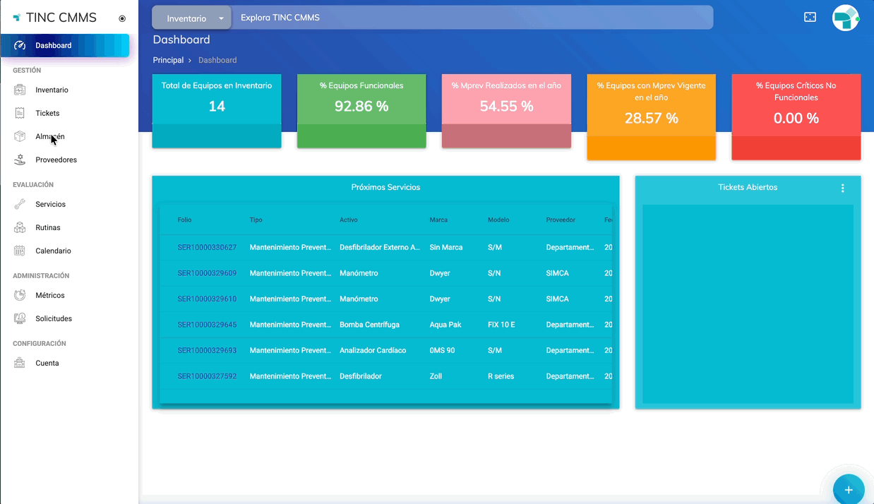El módulo Almacén permite gestionar el registro, consulta y control de materiales, partes y categorías, facilitando la administración del inventario y el control de existencias dentro de TINC CMMS IS.